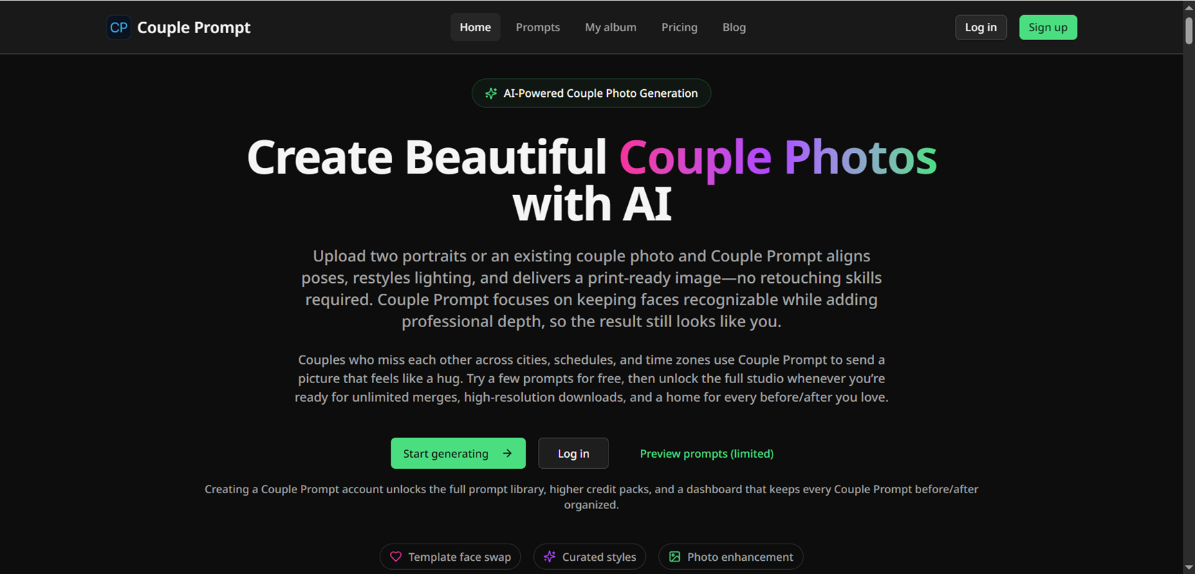 AI Couple Photo is an AI-powered platform that merges two solo photos into a realistic couple portrait within seconds. It aligns facial lighting, skin tones, and poses so that individuals appear naturally together in a studio-quality image—even if they were photographed separately. Users simply upload two images, choose a theme or background (such as wedding, casual, travel), and let the tool generate the combined result. The platform offers style customization, pose options, and background scenes which make it useful for anniversaries, social posts, surprise gifts, or virtual couple photos when partners are remote. With minimal effort, users can create a shareable image that looks like it was taken together rather than composited.