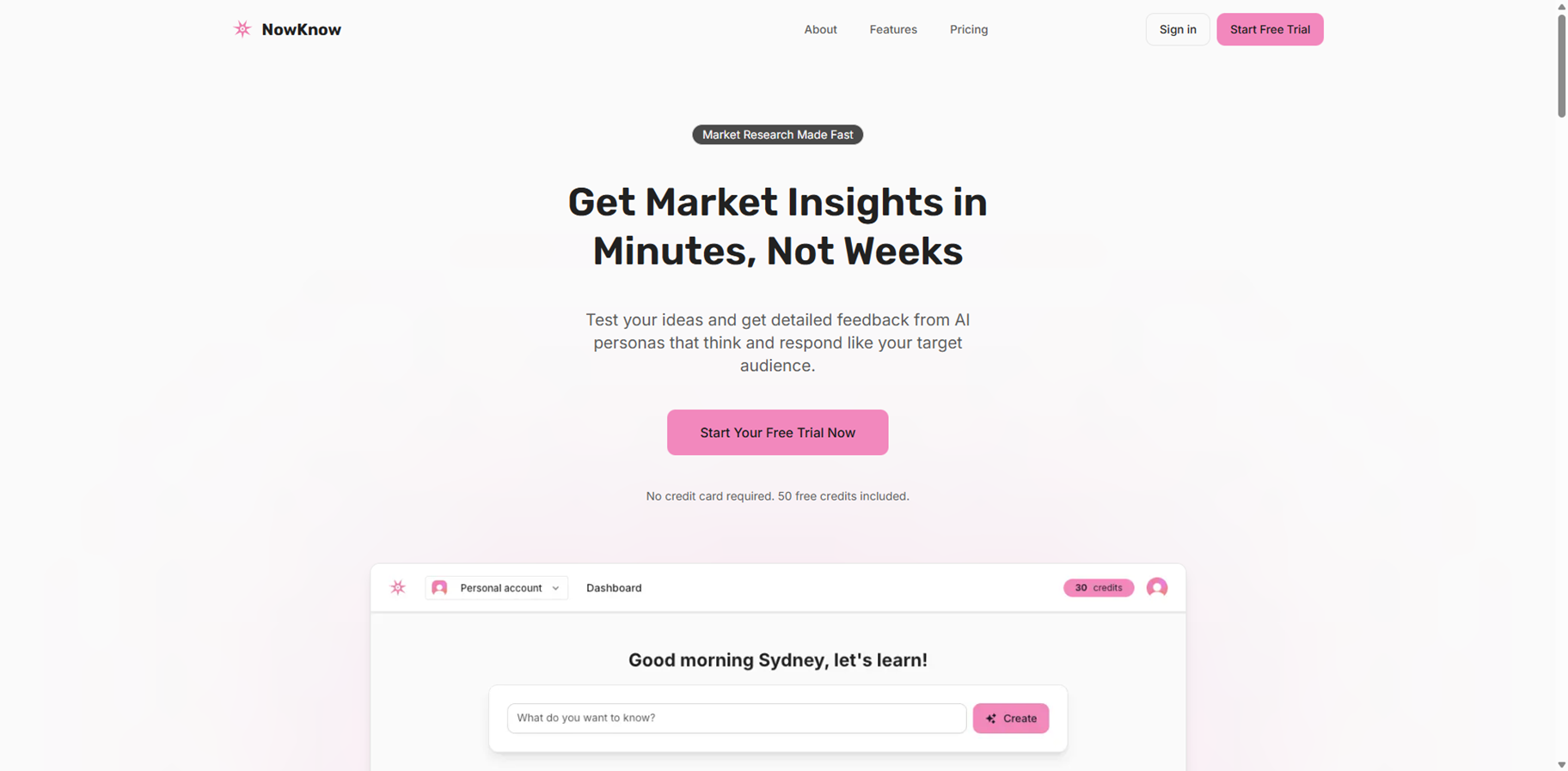 NowKnow is an AI-powered market research platform that delivers instant feedback on ideas, designs, and concepts from virtual personas mimicking your target audience, replacing weeks of traditional surveys with minutes of insights. Upload images for logos, interfaces, thumbnails, or ads, and select demographics like age, location, and interests for tailored responses without GDPR/CCPA compliance hassles. It supports comparing variations, testing messaging, validating business ideas, and optimizing visuals, with free 50 credits to start and flexible plans for startups to enterprises.