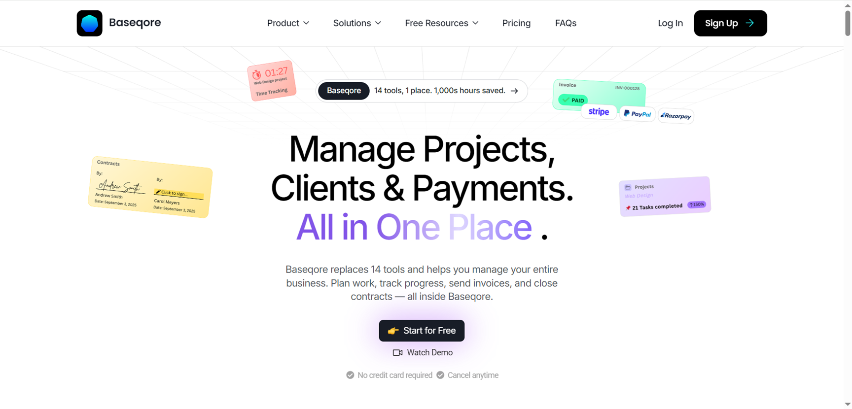 Baseqore is a powerful all-in-one business management platform designed for freelancers, small businesses, and teams to streamline workflows and get paid faster. It combines tools like smart invoice management, contract maker with e-sign, project and client tracking, time tracking, and payment integrations with Stripe and PayPal into a unified workspace. Users can send proposals, sign contracts, log billable hours, create branded invoices, automate reminders, and collaborate seamlessly without juggling multiple apps. The platform supports 30+ languages for global reach and offers real-time notifications for deadlines and updates.