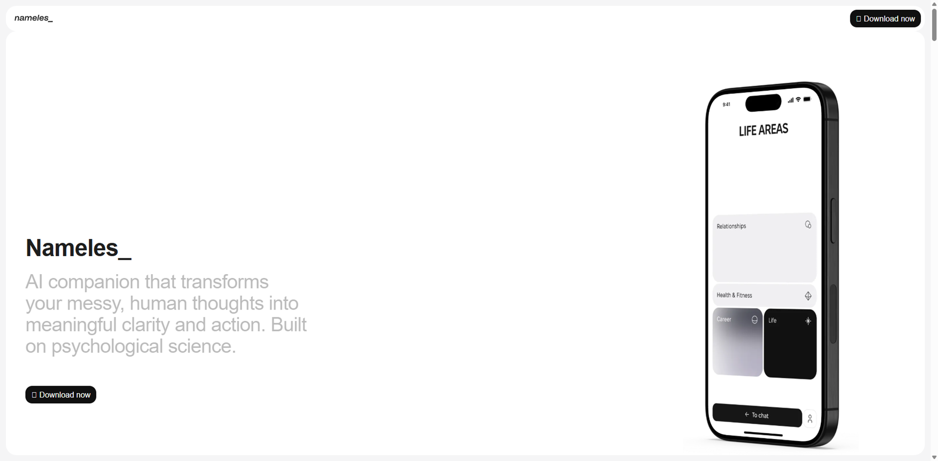 Nameles is a private AI companion app designed to help you unpack overwhelming emotions, spot repeating life patterns, and gain real clarity through natural, ongoing conversations. It remembers everything you share, your feelings, relationships, goals, and situations, building a deep, personalized understanding that evolves as you do. Unlike generic chatbots, it learns your unique triggers, connects dots you might miss, and guides you gently without judgment, making it feel like talking to someone who truly gets you. Perfect for those moments when you're stuck in your head or just need support anytime, it's always available to process tough stuff and help you move forward. Download it to start your journey in a space that's 100% yours, secure, and adaptive to your life.