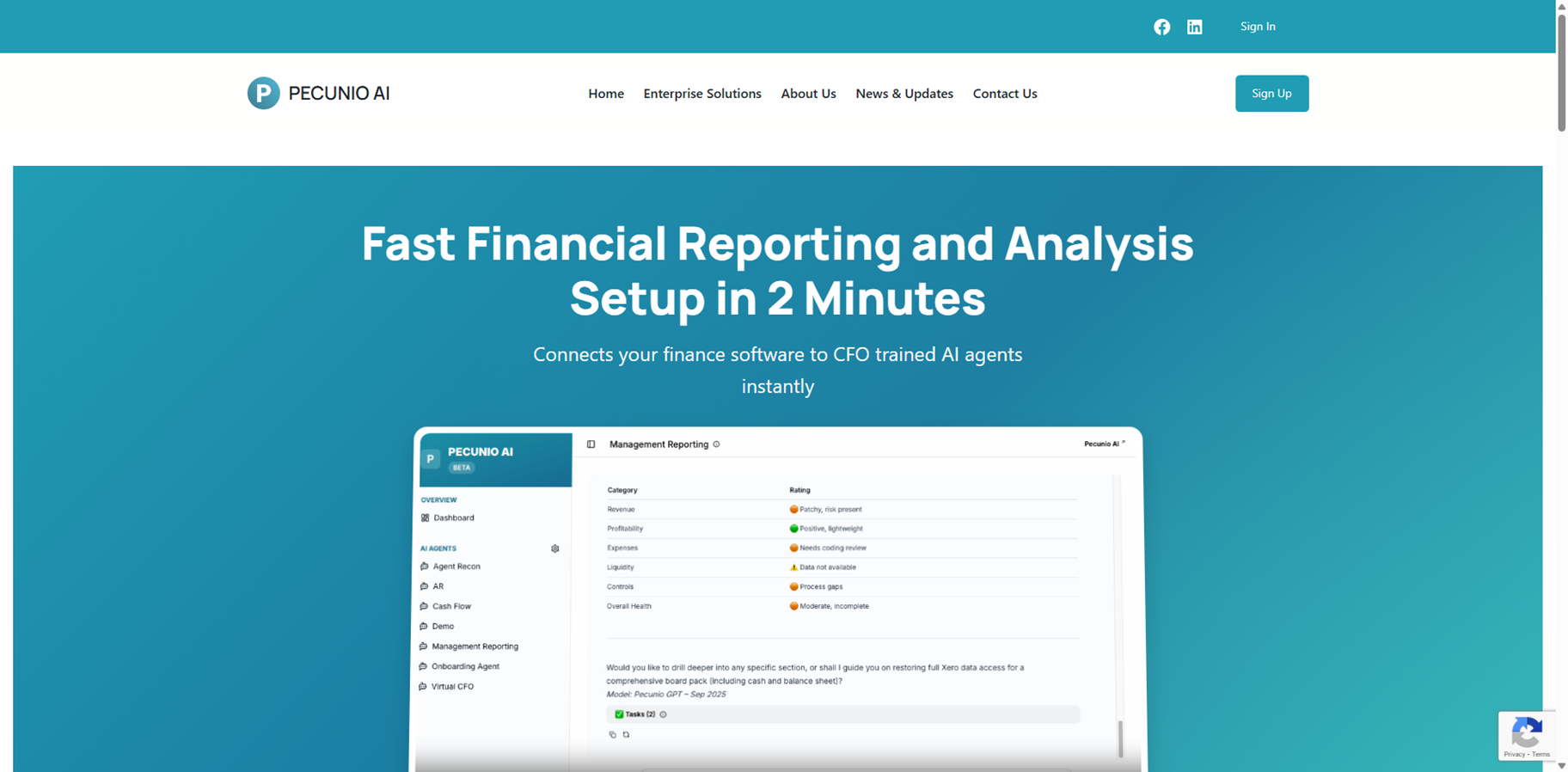 Pecunio AI is a finance-focused AI platform that connects directly to your existing toolslike Xero, Stripe, and QuickBooks so you can ask financial questions in plain English and get instant, CFO-level insights. Instead of wrestling with spreadsheets or waiting days for reports, you plug in via secure OAuth, benefit from bank-level encryption, and let purpose-built AI that understands accounting principles handle the heavy lifting. It generates comprehensive reports in seconds, explains results clearly, and offers ranked recommendations so you always know what action to take next. With real-time forecasting, cash flow modeling, and 24/7 financial health monitoring with alerts, Pecunio AI keeps your business ahead of surprises.