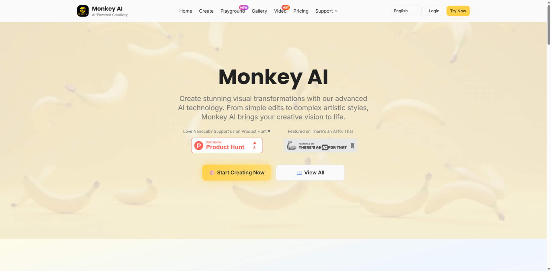 Monkey AI is a sleek AI image generator that turns your wildest ideas into stunning visuals in seconds. Just upload a description or reference image, hit generate, and watch it remix your concepts into high-quality art, from realistic portraits to fantasy scenes. It shines with advanced models like Nano Banana and Nano Banana Pro for pro-level details, perfect for designers craving quick iterations without starting from scratch. Explore the gallery for endless inspiration, showcasing hot trends and original creations that spark creativity. Whether you're crafting social media graphics, book covers, or personal projects, its intuitive interface makes powerful AI accessible to anyone. Dive into remix features to blend styles effortlessly, producing unique outputs every time. Backed by flexible plans, it's built for creators who want speed and quality without the steep learning curve.