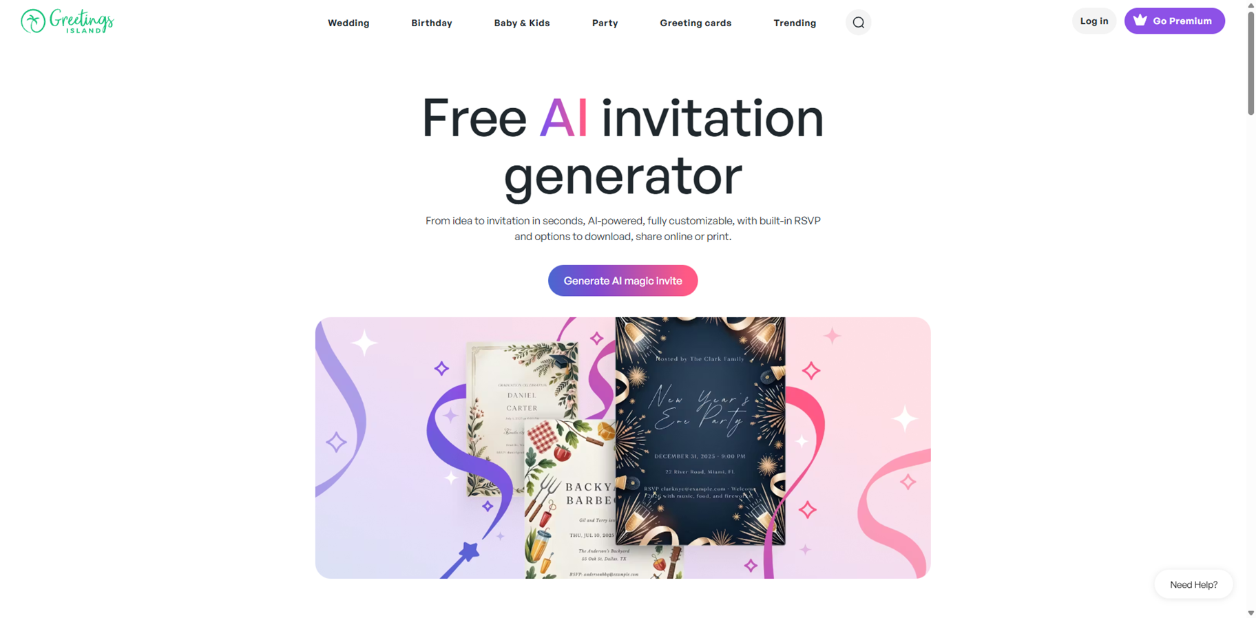 Greetings Island AI Invitation Generator is a free, user-friendly tool that crafts custom invitations for any event using simple text prompts. Just describe your occasion, like a birthday bash with unicorns or a rustic wedding, with details on date, time, location, and theme, and the AI whips up a ready-to-edit design in seconds. Unlike basic AI image generators, it hands you full control in their powerful editor to tweak text, fonts, colors, move elements, and add stickers or photos. Perfect for weddings, baby showers, parties, holidays, graduations, and more, it covers endless themes from elegant florals to playful dinosaurs. Download to print, share digitally, or manage RSVPs easily, all in one spot. It's a game-changer for quick, personalized invites without design skills.