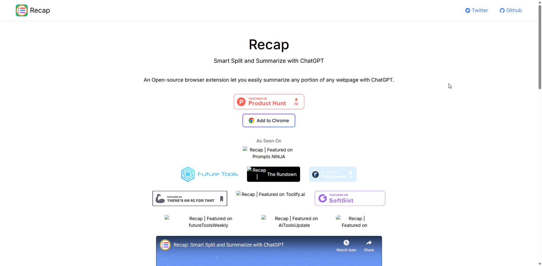 Recap is an open-source browser extension that lets you smartly split and summarize any portion of any webpage using ChatGPT, directly from your browser. Designed for readers, researchers, and knowledge workers, it simplifies long or complex pages into clear, concise takeaways without leaving the tab. Users can quickly select the section they care about, trigger a summary, and get a distilled version powered by their chosen ChatGPT or OpenAI model. By focusing on flexibility and transparency, Recap makes AI-assisted reading more controllable, customizable, and privacy-aware.