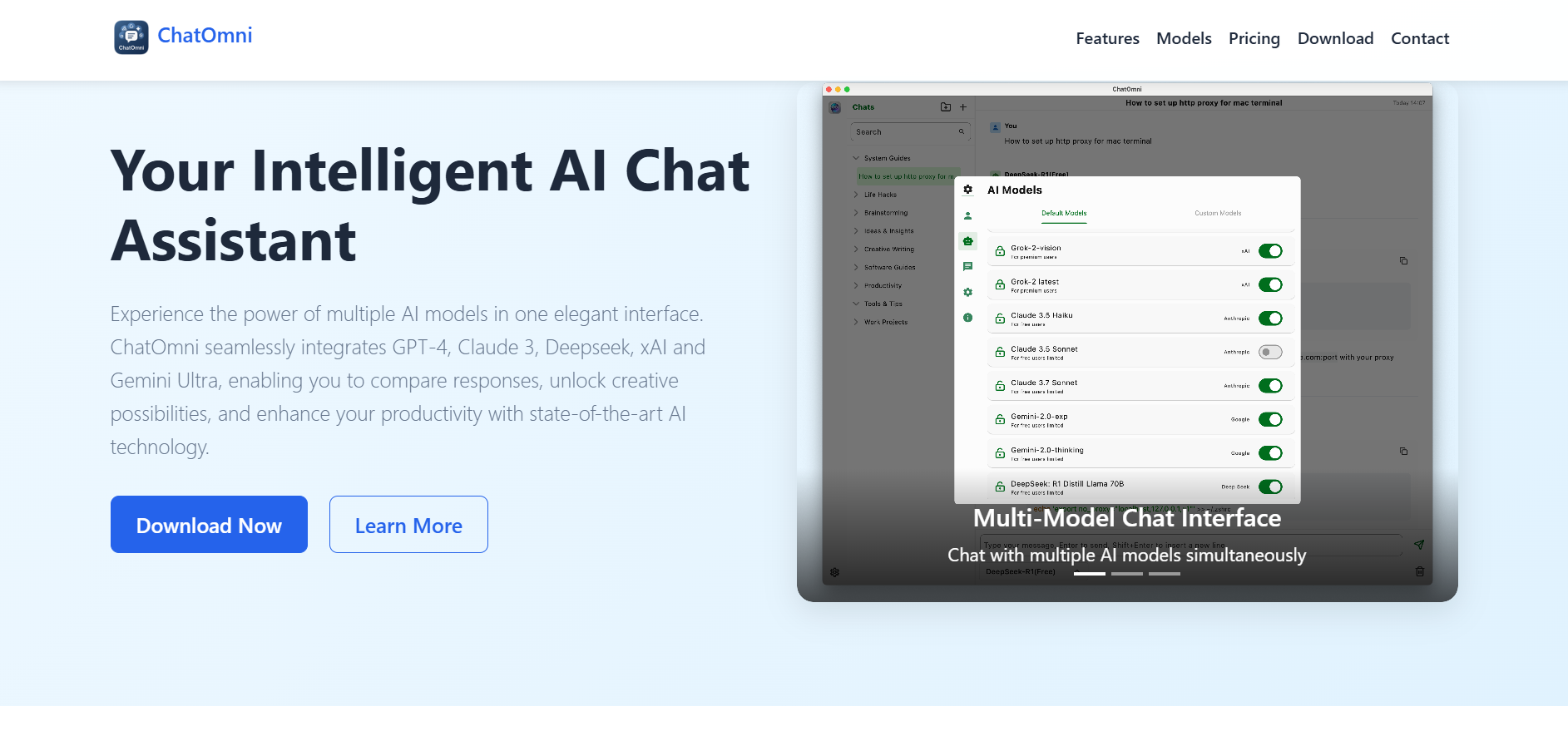 ChatOmni is a multi-model AI chat platform that brings together multiple leading AI models into a single, unified conversational interface designed to enhance user productivity, creativity, and information depth. The platform supports top-tier large language models such as GPT-4, Claude 3, xAI Grok, Gemini Ultra, and Deepseek, allowing users to chat, compare responses side by side, and tailor outputs to their needs without switching between tools. ChatOmni provides advanced chat management features, including unlimited history, folders, advanced search, and export options, enabling users to organize interactions efficiently. With custom API key support and automatic updates to the latest available models, the platform is positioned as a flexible, evolving AI assistant for research, writing, design, brainstorming, and multi-model comparison workflows across professional and personal contexts.