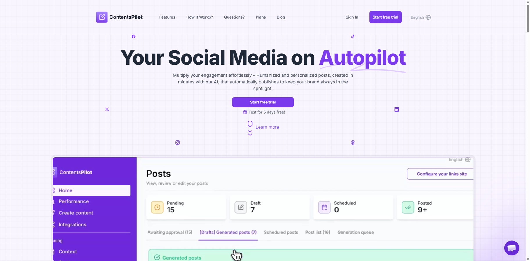 Contents Pilot is an AI social media content generator that crafts humanized, personalized posts in minutes and auto-publishes them to keep your brand shining 24/7. It automates the full workflow: brainstorming ideas, drafting captions, picking visuals, optimizing post times, and analyzing performance to multiply engagement effortlessly. Train it on your brand voice so every tweet, story, or reel feels authentic while saving hours for strategy. Marketing teams love how it repurposes content across platforms, adds SEO smarts, and tweaks for better reach. From captions to full campaigns, it learns from metrics to refine output, turning fast-paced posting into a superpower.