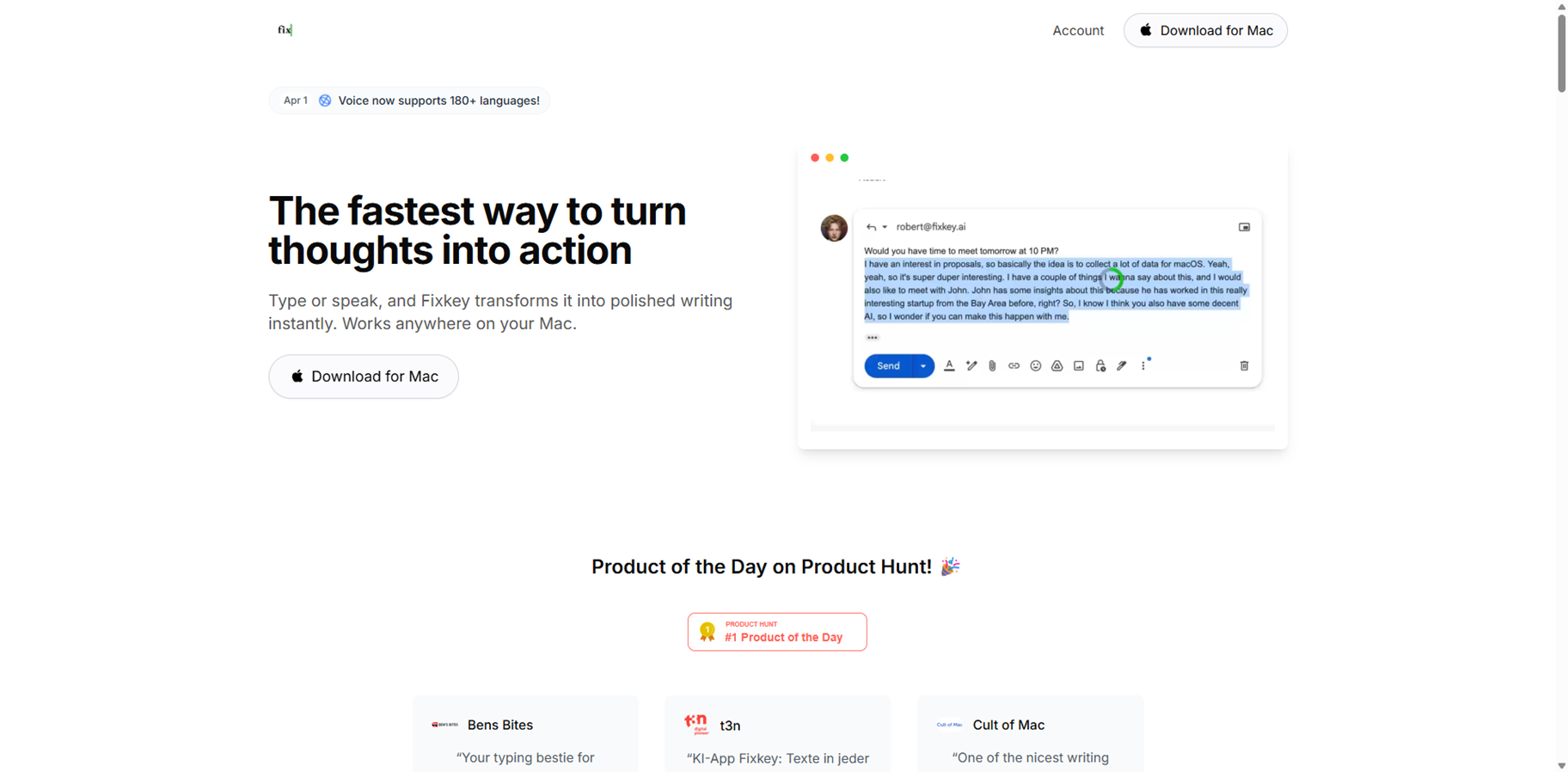 Fixkey is a lightning-fast AI writing assistant built natively for Mac, turning raw thoughts or speech into polished, formatted text anywhere on your system. Speak or type casually, and it instantly rewrites, translates to 180+ languages, or refines with one shortcut—no app switching needed. Features real-time voice-to-text with high accuracy, auto-language detection, custom prompts, and ultra-low 200ms latency for seamless flow. Lightweight and keyboard-driven, it boosts productivity in browsers, notes, or any app. Loved by 20k+ users including Blinkist founder, it handles voice commands for formatting too. Free download with pro upgrades.