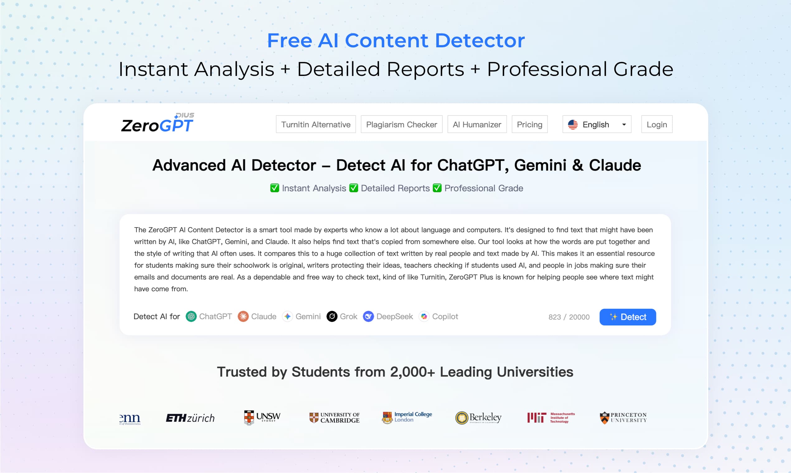 AI Text Checker is a sophisticated AI-powered content verification and refinement platform that detects AI-generated text with high accuracy and helps make it sound more human. It supports major language models such as ChatGPT, GPT‑4, Gemini, Claude, and others, offering seamless detection of AI-authored or AI-refined content without requiring a login. Beyond detection, the platform provides actionable suggestions to enhance readability, reduce robotic tone, and improve the overall human quality of text.