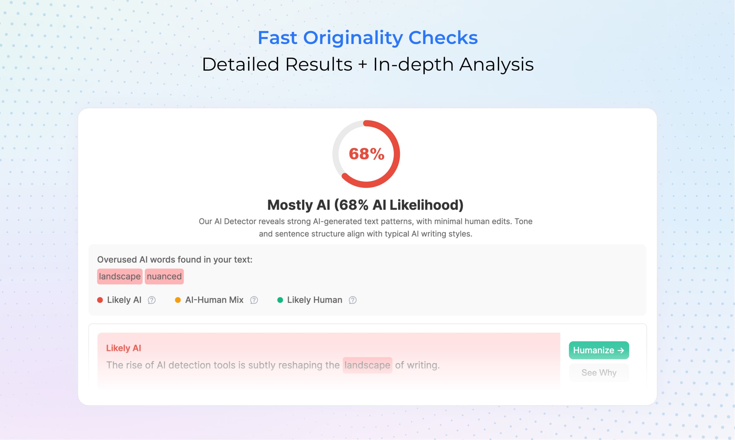 Humanize-AI.top is a tool designed to convert AI-generated text into more natural, human-like writing. The service claims to help users bypass AI detection and achieve 100% originality by rewriting content generated by popular AI models like ChatGPT, Bard, and Jasper, making it sound more authentic and less robotic.